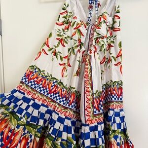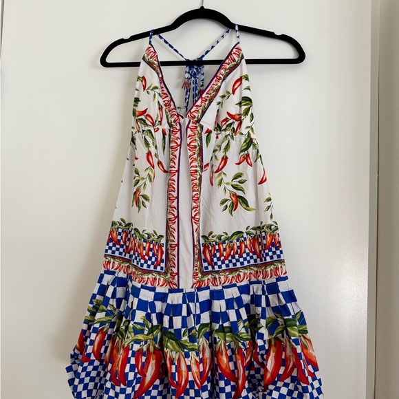 Vibrant mini dress by FARM Rio. Features a mix of red, green, and blue patterns. Perfect for a lively look.