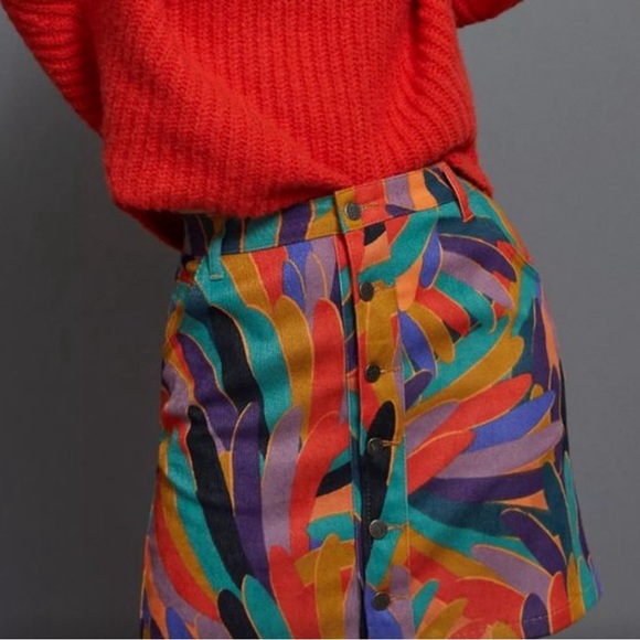 Vibrant mini skirt with button details. Features a bold, multicolor pattern.