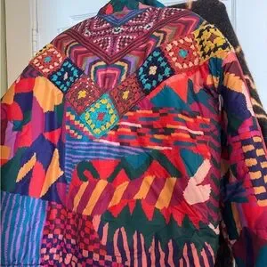 Bold and vibrant patchwork design. Reversible style for versatile wear. Eye-catching and unique.