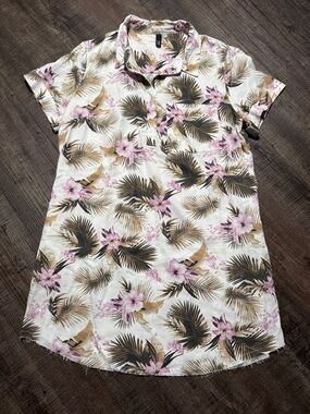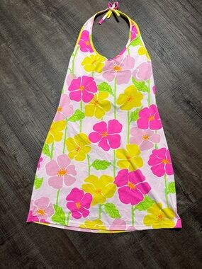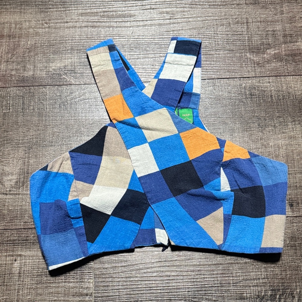 Vibrant patchwork design. Features blue, orange, and cream tones. Sleeveless with a unique pattern. Excellent condition.