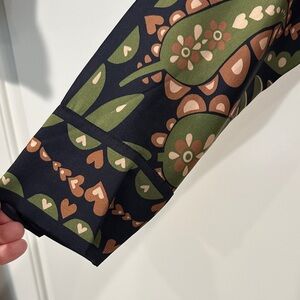 Vibrant long sleeve dress with a bold pattern. Features green, orange, and black colors. Wear as dress or tunic! Comes with tie belt.