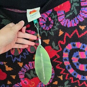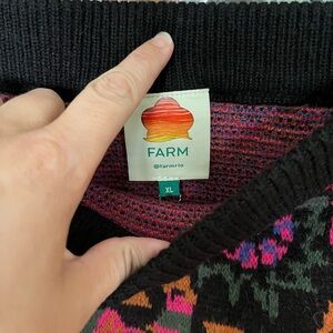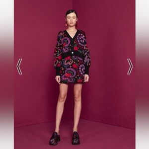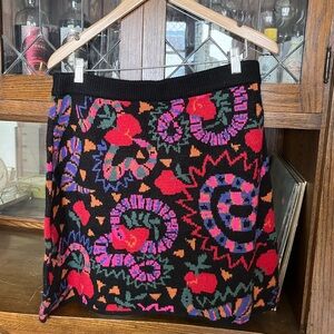 Vibrant mini skirt with bold patterns. Features red, purple, and orange designs on a black base. Perfect for a standout look.