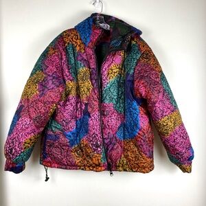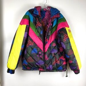 Bold puffer jacket by FARM Rio. Features vibrant patterns and colors. Eye-catching and stylish.