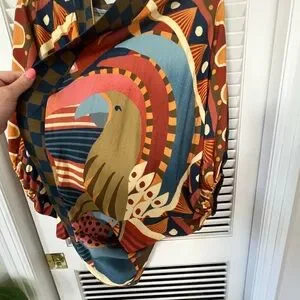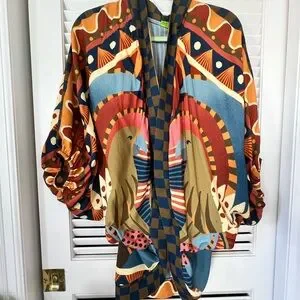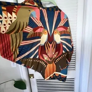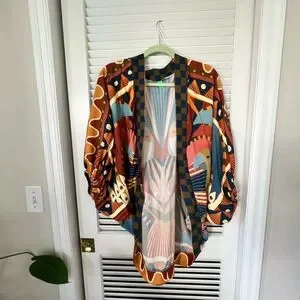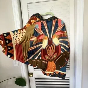 Vibrant FARM Rio top with bold patterns. Features shades of orange, blue, and tan. Unique design with artistic flair. Farm Rio open cardigan with balloon sleeves and a gorgeous boho toucan print. It’s lightweight, breezy fabric, perfect for beach vacations when the evenings get a bit chilly. Or could also be a beach coverup, or for any day when you want to bring the sunny, tropical vibes. I bought it in Brazil. Only worn a few times. Says one size, but I’d call it a medium. This is a rare piece, not sold in the U.S.! Make me an offer! #farm #farmrio #tropical #boho #toucan #kimono