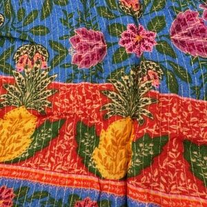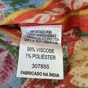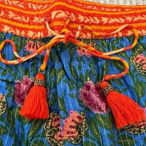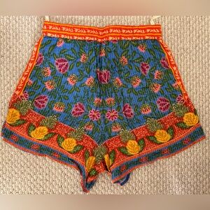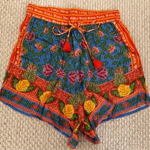 Vibrant Farm Rio flowy shorts with a fun pattern and golden stripes. High waisted with drawstring adjustable elastic waist.