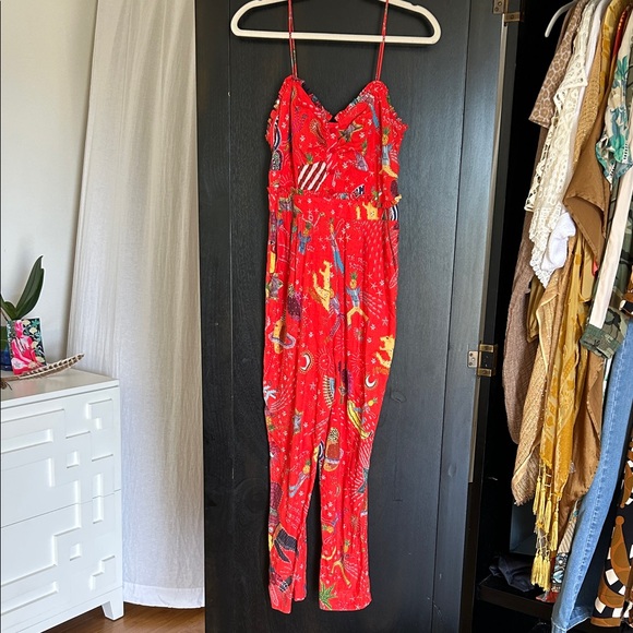 Bright red jumpsuit with vibrant patterns. Strappy design for a stylish look. Perfect for lively occasions.
