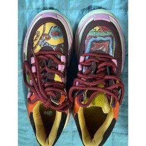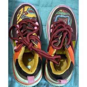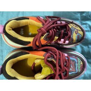 Bold sneakers with a vibrant mix of colors. Features red laces and pink details. Stylish and comfortable.