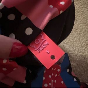 Vibrant FARM Rio bikini with bold stripes and polka dots. Features a mix of blue, pink, red, and green hues. Perfect for a stylish beach day.