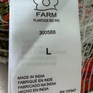 Vibrant tropical blouse with square neck. Features red, green, and orange patterns. Elegant lace details on sleeves.