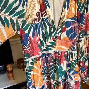Farm Rio cotton Macaw dress. Bold tropical print with a V-neckline. Features long sleeves, fully lined and a tiered skirt. Ideal for vibrant outings. Only worn once.