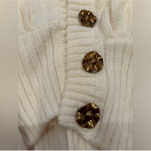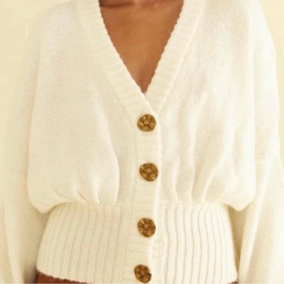 Elegant cream cardigan with wooden buttons. Soft knit fabric. Perfect for layering.