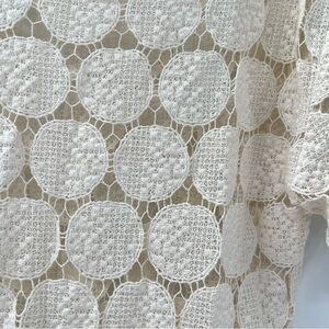 Elegant cream lace top. Features intricate circular patterns. Short sleeves and round neckline. Perfect for layering.