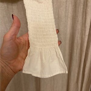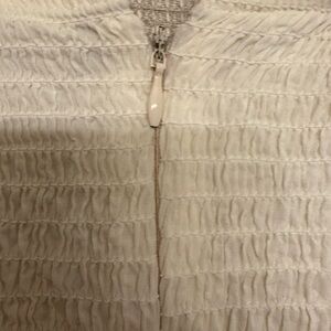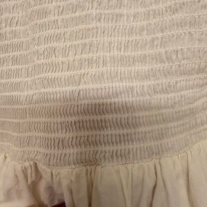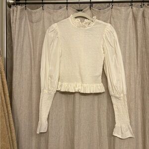 Elegant cream blouse with ruffled details. Long sleeves with smocked cuffs. Smocked and fitted bodice. Super versatile piece. Wear with jeans, pants or a skirt. Back zipper. No stains or defects.