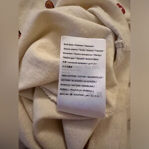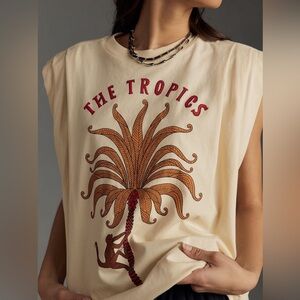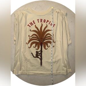 Cream short sleeve tee with tropical print. Features palm tree and red text design.