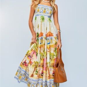 Chic strapless dress by FARM Rio. Features a scenic print with vibrant colors. Ideal for sunny days and casual outings.