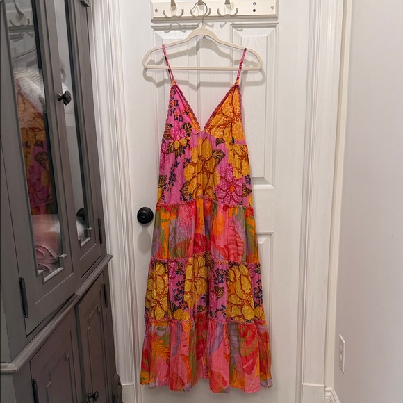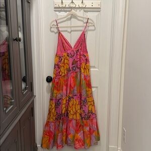 Farm Rio maxi dress with floral patterns. Pink, orange, and yellow hues. Perfect for a summer day! Low back & adjustable spaghetti straps. NWOT and never worn. Got this last year while I was pregnant and never ended up wearing over the summer. So gorgeous!