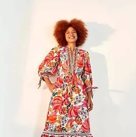 Vibrant floral dress with long sleeves. Features a mix of colors and intricate patterns. Perfect for a bold, stylish look.