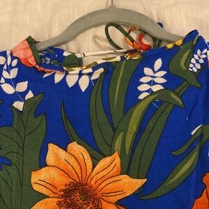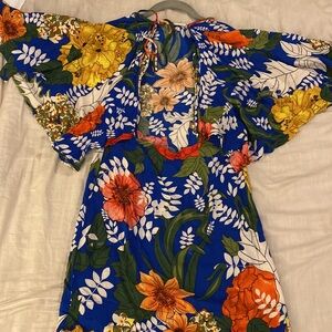 This is the perfect floral dress. Full open back with tie back at neck. Kimono style sleeves caped over shoulders. Excellent condition