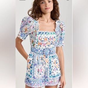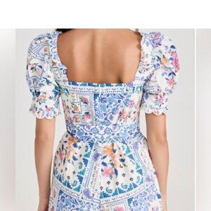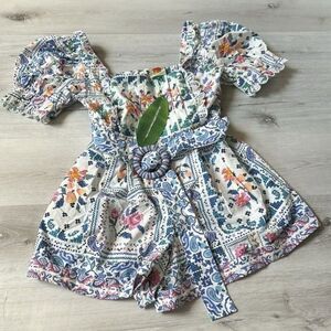 Charming floral patchwork design. Square neckline with ruffle trim. Short puff sleeves. Belted waist with floral buckle.