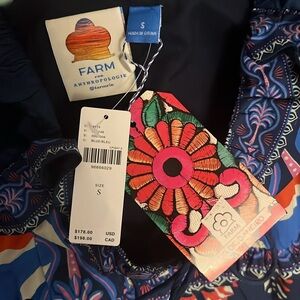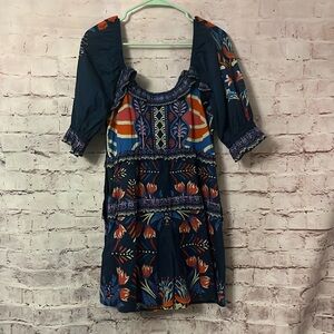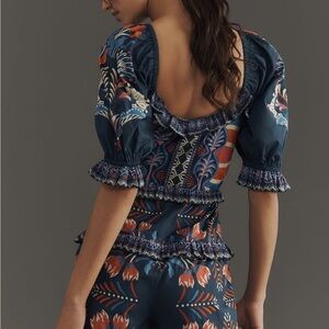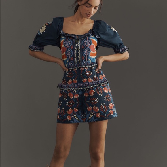 Vibrant romper by FARM Rio. Features a floral pattern with blue, orange, and red hues. Short sleeves and square neckline.