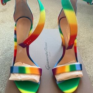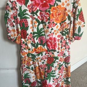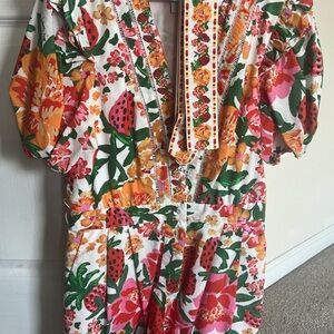 Vibrant floral romper with ruffle sleeves. Features a deep V-neck and colorful pattern. Received several compliments.