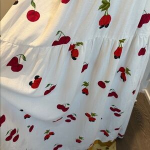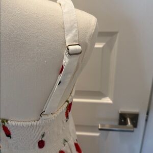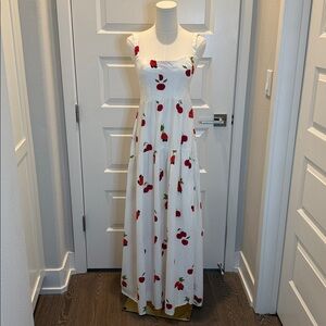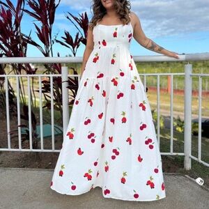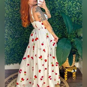Step into elegance with this FARM Rio sundress, perfect cocktail events. The white base is adorned with a delightful fruits print, adding a touch of whimsy to its classic design. Its sleeveless style ensures a chic and sophisticated look for any special occasion.