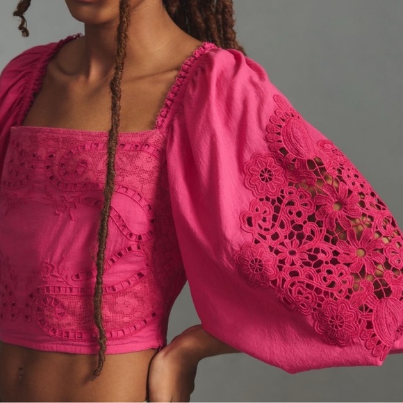 NWT Chic PINK BOHO blouse SIZE SMALL with detailed embroidery. Stylish puff sleeves. Crop waist. Perfect for a bold look.