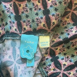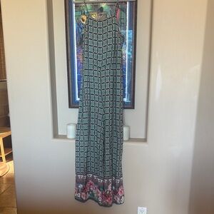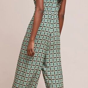 Stylish jumpsuit with geometric design. Features black, green, and pink hues. Perfect for a chic look. Check photo for stitch unraveling base of back zipper