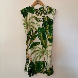 Vibrant tropical print. Sleeveless design. Perfect for summer.