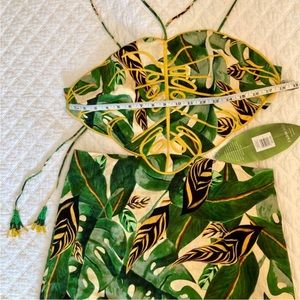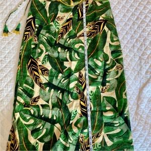 Tropical print midi dress. Strapless design. Vibrant green and yellow pattern. Perfect for summer.