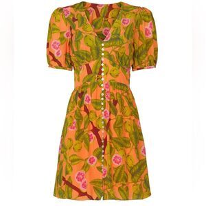 Discover the effortless charm of the Farm Rio Guava Mini Dress. This dress gives jungle play in muted guava tree patterns, intertwining leaves and guava fruit motifs with playful shapes. The slight balloon sleeves add a touch of whimsy, and the v-neckline and pearlized button-line down the front creates a playful silhouette. Made from responsible materials, it promises both style and conscious comfort. Let your wardrobe be a canvas.