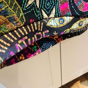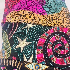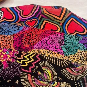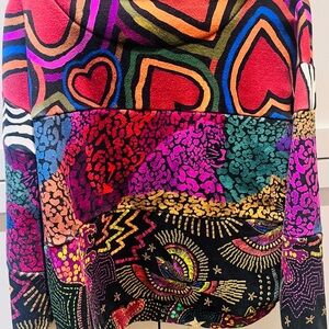 Vibrant crew neck sweater with bold patterns. Features hearts, leopard print, and abstract designs. Perfect for a statement look.