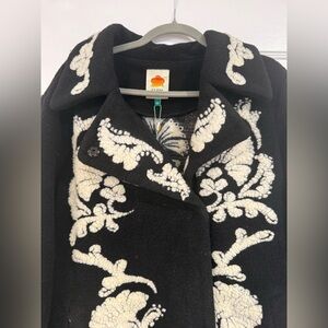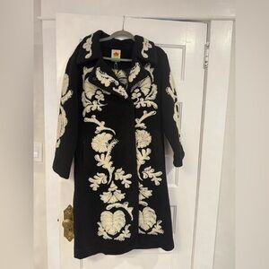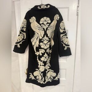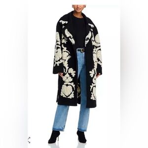 Long coat with bold cream floral jacquard on a black background. Cozy, relaxed silhouette. Easy to layer over casual outfits. Comes with loops for belt if you want to wear a belt with it. Snap closure