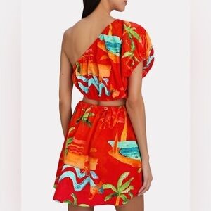 FARM Rio Ipanema One-Shoulder Cut-Out Mini Dress. NWT, never worn. Featuring an easy-breezy silhouette bringing a one-shoulder neckline and cutout waistline to show more skin, and a flowy skirt to follow your bold moves in every place, every wear. Easy fit. One-shoulder neckline. Cut-out waistline with knot detailing. One puff sleeve Unfortunately it was not my size. Approximate measurements provided in listing photos. Please see all photos and ask questions as pictures are a part of the description.