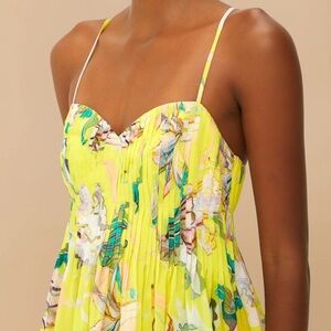 Bright yellow maxi dress with floral patterns. Features layered design and thin straps.