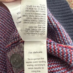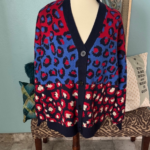 Vibrant and absolutely beautiful leopard print cardigan. Features bold red and blue patterns with navy trim. Button-up front. Cozy and stylish. This is oversized and depending on size preference can fit M/L, see measurements to make sure. New with tags!