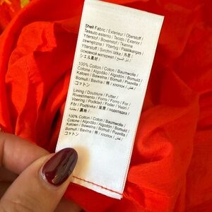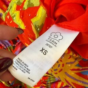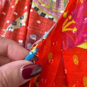 Vibrant tropical print dress. Features bold patterns and long sleeves. Perfect for a statement look. One of the strings on the front is slightly frayed, but it came that way and was extremely hard to find in my size, so I just kept it. Excellent condition overall