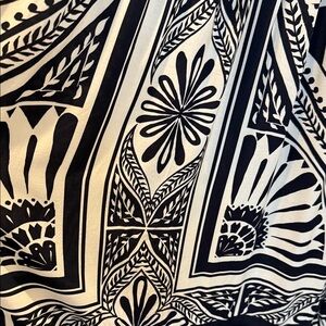 Chic long dress with intricate black and white patterns. Spaghetti straps and flowing silhouette. Perfect for stylish outings.