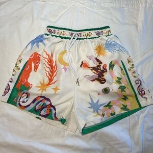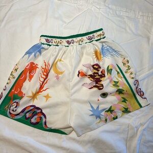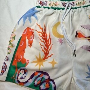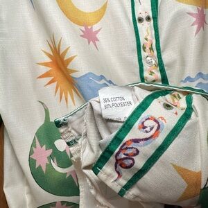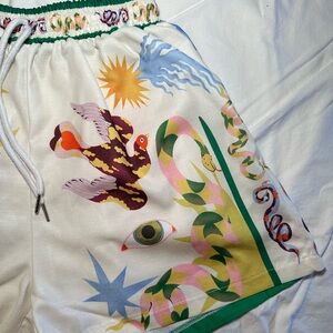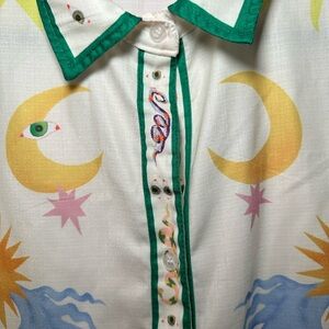 Vibrant button down and shorts with playful graphic design. Features green and white tones with colorful accents. Perfect for a bold look.