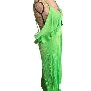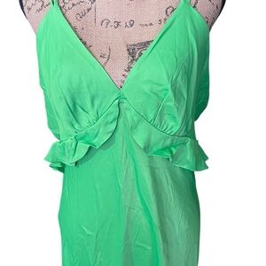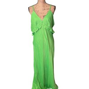 Elegant maxi dress with a vibrant green hue. Features a flowing silhouette and delicate straps. Perfect for any occasion. Strappy back. New with tags in a size XL. Laying flat pit to pit 22in. Length 53in. Does have a small line on bottom look at picture. I’m sure it can be washed out.
