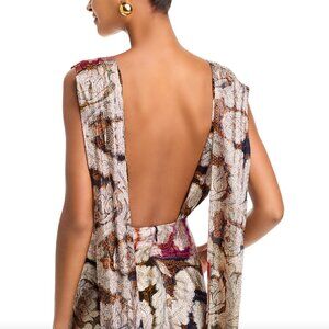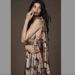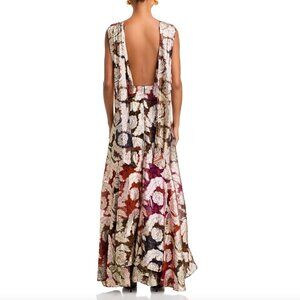FARM Rio Metallic Plunging V-Neck Gown/Maxi Dress. A red, black & plum base, with allover metallic gold accents. Size XL. NWT. NWT, in pristine condition, never worn & no flaws. An absolutely breathtaking statement gown from FARM Rio’s more elevated collections. ✨ Allover floral & leaf pattern that's a beautiful example of a classic damask design. ⚜️ Lightweight, fluid & truly ethereal. Perfect for Fall weddings, formal dinners, or holiday parties. 🍁 - Lightweight chiffon-like jacquard fabric with woven metallic fibers - Plunging V-neck & low back - Self-tie shoulder straps that can be worn as draped sashes or tied into bows - Sleeveless - Banded waist for definition - Concealed side zip closure - Partial lining: bust lined; lower lining features a bodysuit with snap closure - Shell: 79% viscose, 21% polyester | Bodysuit: 89% polyester, 11% elastane | Bust lining: 100% viscose - A delicate, show-stopping fabric that should be worn with pride & handled with care 💖 Measurements (unstretched/laying flat & approx.): - Natural waist or underbust: 17.5" (elasticized band offers medium level stretch) - Length, from V-neck to hem: 39"-43" Tags: FARM Rio gown, FARM Rio maxi dress, metallic gown, plunging neckline dress, fall formal dress, autumn wedding guest, gala gown, holiday party dress, formal eveningwear, statement dress, damask-inspired floral, arabesque-style print, Eastern motif, resort formalwear, sustainable fashion, ethical fashion, brands from the Global South