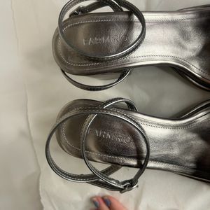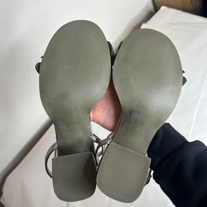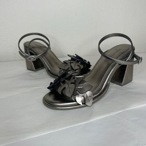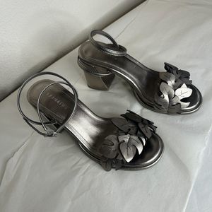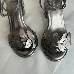 Elegant metallic silver heels with leaf design. Chunky heel and ankle strap for support. Perfect for stylish occasions.