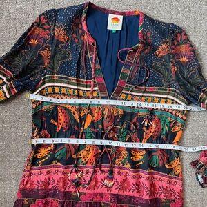 FARM Rio Mixed Patchwork Midi Dress Long Sleeve Tie Neck Size Small