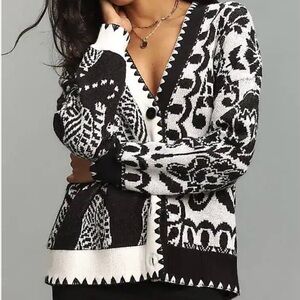 Chic black and white cardigan with bold patterns. Perfect for layering and adding style.