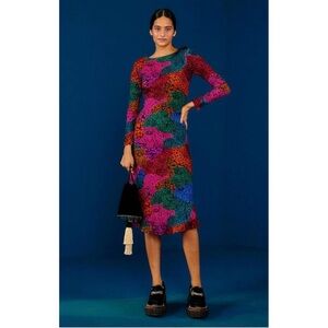 Vibrant midi dress with abstract pattern. Long sleeves. Perfect for any occasion.