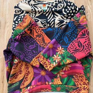 Vibrant sweater with bold animal and floral prints. Features a mix of colors for a standout look. Perfect for adding a pop of color to any outfit.