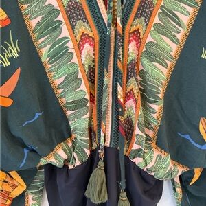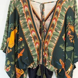 Vibrant bodysuit with tropical print by Brazilian brand Farm Rio. Features tie detail on the back and flowing kimono sleeves. Perfect for a bold look. Last 2 picture to reference fit only. Retails new for $180
