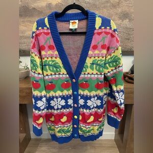 Vibrant cardigan with a playful fruit and floral design. Features a bold blue trim and colorful buttons. Perfect for a lively look.