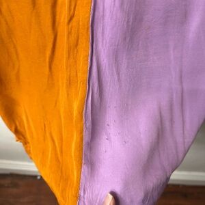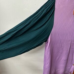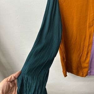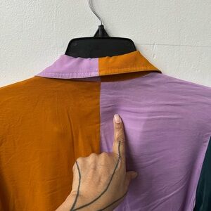Colorful button-down with bold patch pocket. Features purple, orange, and red with dark green sleeves. Eye-catching and stylish.