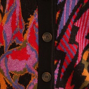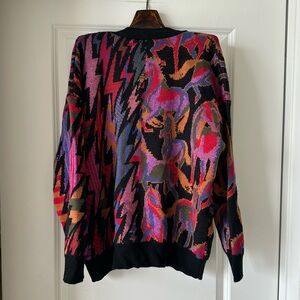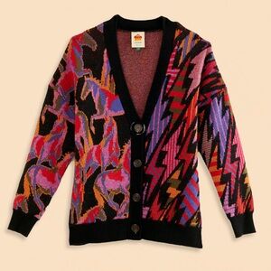 Vibrant cardigan with bold patterns. Features button-up front. Perfect for layering.